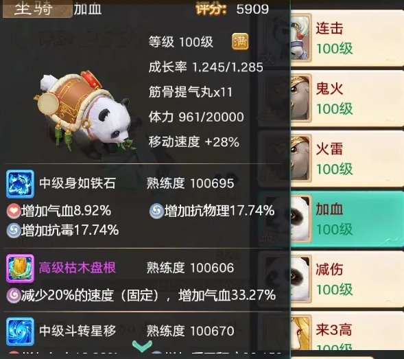 坐骑:枯木盘根为核心技能,带抗物理、伤害法术为优。