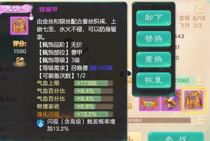 配饰:兽铃、环以抗伤害法术为主,兽甲增加气血为主,其他属性随意;支援站桩宝宝,有强化隐身、闪现比较好。