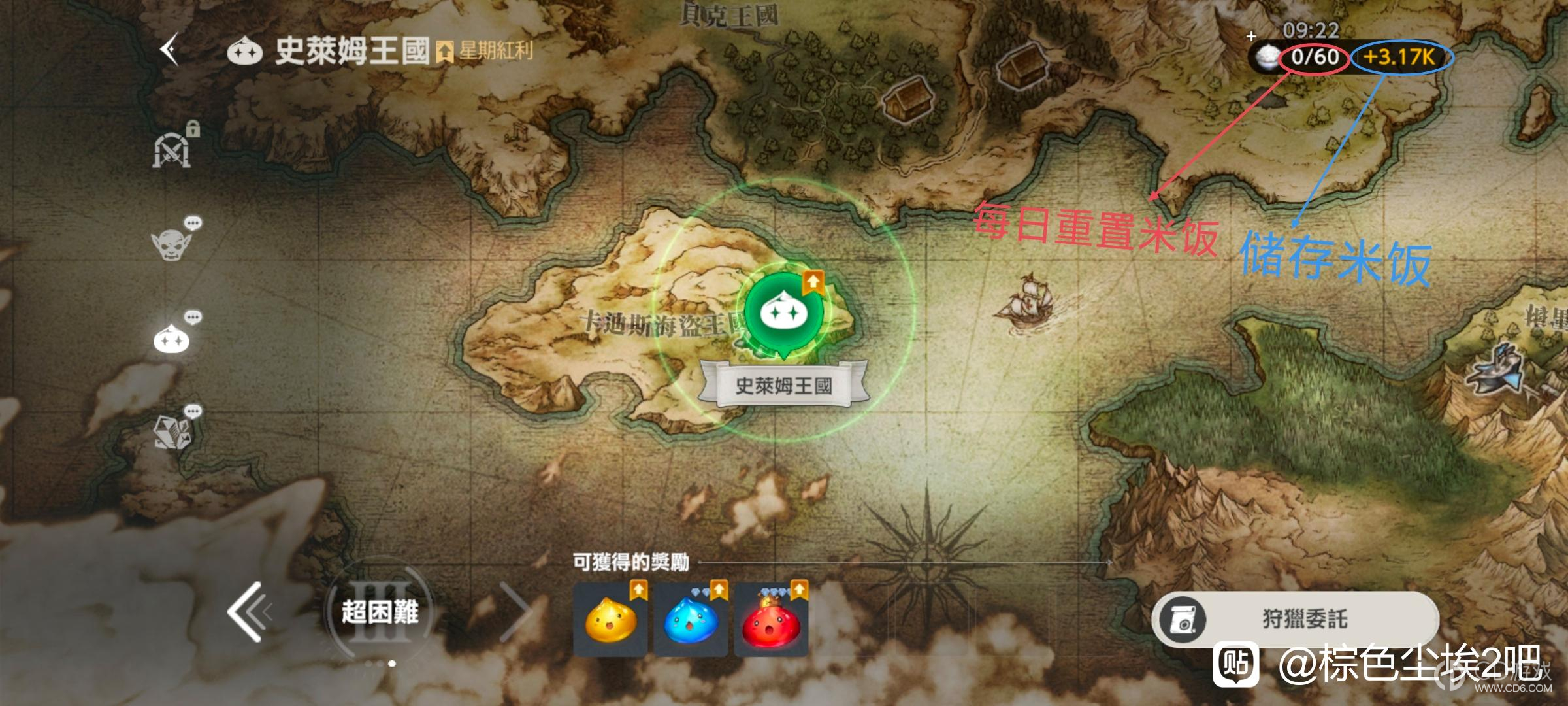 狩猎委托:主线推到第四章后特别卡带冒险航线开启了,每天重置60米饭和60火炬,超困难越早打收益越多,所以当天达到一定练度后前往卡带过场剧情后找船长进入史莱姆和哥布林的狩猎场(先进哪个可以看当天的加成,不过哥布林比史莱姆难度稍高一点,可以先过超困史莱姆提升练度再打超困哥布林),狩猎场需要打败魔王才能前往更高难度,普通难度打死魔王后离开重新找船长进入困难难度,超困难同理。圣石洞穴超困难度相对高一点,练度不够先过困难就是了,至于打哪个看你自己的需求或根据当期季节加成和属性大c。
