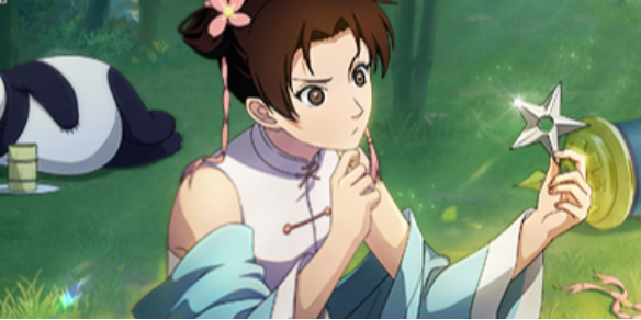 释放奥义后,峨眉天天展开卷轴,伴随着一阵烟雾,伙伴熊猫与珍藏的兵器出现,峨眉天天和熊猫配合,将兵器逐个射向对手,最后一起上前挥动拳头将对手打飞。奥义结束后可接技能。