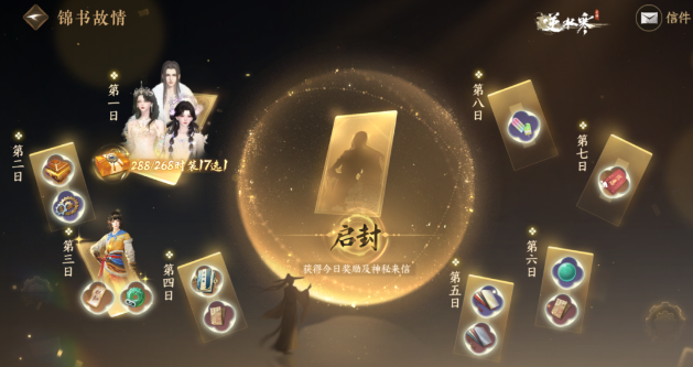 将逐一启封信笺,获得 288 自选时装礼盒、时装・行者悟空、1000 纹玉代金券、630 绑玉、半价券、全新配饰等奖励。