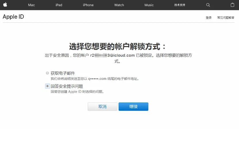 4、解锁方式有电子邮件解锁和安全问答解锁,以选择“回答安全提示问题”为例,点击继续。