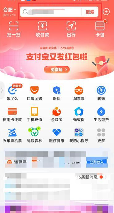 1、进入支付宝后,在上方搜索框输入赚钱红包,进入活动页面中;