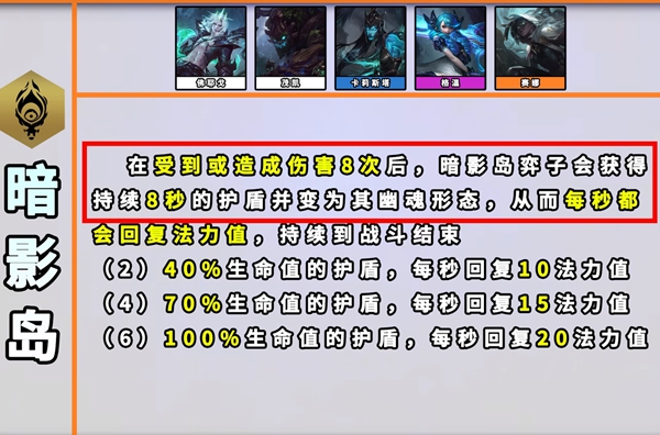 光盾家族:在2-1时提供一个“德玛西亚王冠”,王冠的效果是所有的队友获得王冠携带者20%的双抗
