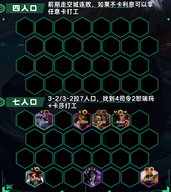 3-2/3-3阶段直接拉7人口,大搜阵容体系,优先找到4司令2恕瑞玛羁绊,如果没有内瑟斯,可以考虑用雷克顿代替,如果没有卡莎,可以考虑用尼菈打工过渡。