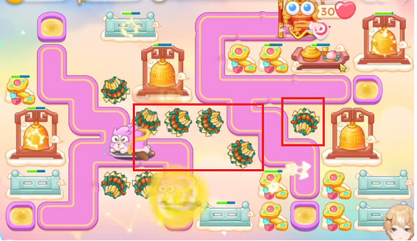 1、开局造两个弓箭升满级,下方打掉道具后加弓箭,也升到满级,解决完第一波全部粉兔后,锁定钱袋。