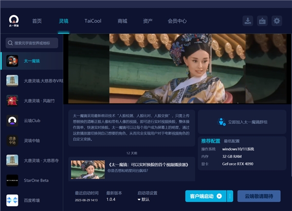 太一灵境是太一集团拥有自主知识产权、优质数字内容和创造性互动体验的元宇宙综合服务平台。平台上集成元宇宙内容,提供元宇宙工具和服务,替开发者创造价值,通过场景、模型、交互等相关的统一标准,实现可以连通多个元宇宙并在其中漫游和创作。太一灵境内容丰富多元,涵盖了大唐灵境等元宇宙场景、StarOne、灵境中轴等元宇宙项目,将会给用户在元宇宙世界带来全新的视觉和体验革命。