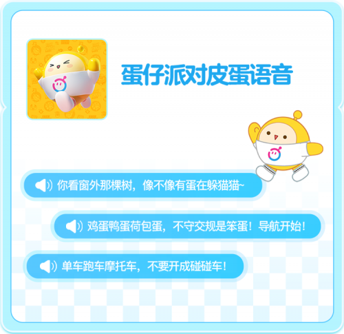 “嘎达、嘎达!马上出发”,熟悉的蛋仔伙伴“皮蛋”走出蛋仔岛与大家一起结伴出行。设定好起始点与终点,皮蛋便会将经典语录信手改编:“鸡蛋鸭蛋荷包蛋,不守交规是笨蛋!导航开始!”活泼的语气带来出行好心情。